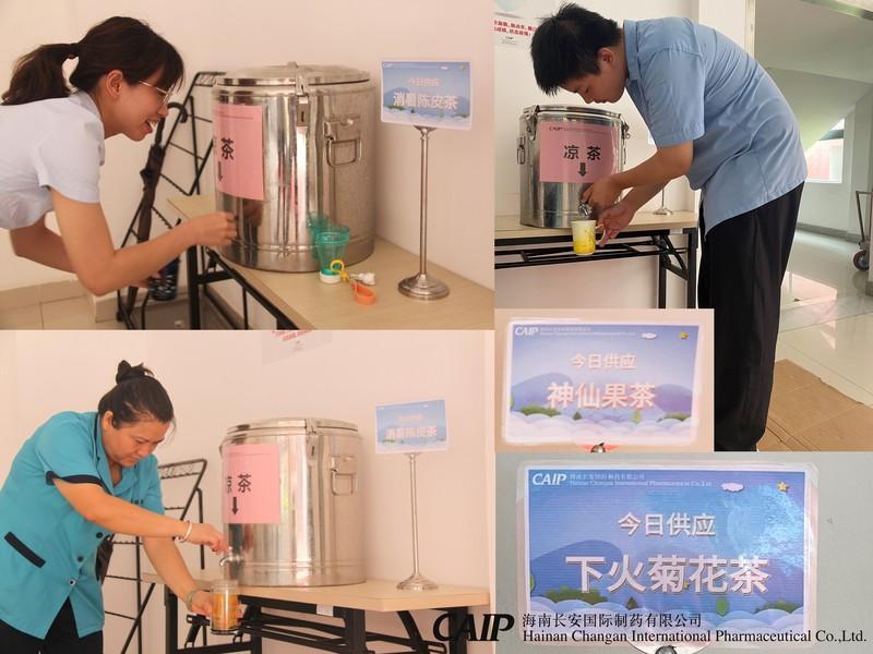 海南已經(jīng)進(jìn)入了炎炎夏日,長安制藥為了關(guān)愛員工,決定在6月到10月,每周一、 周五推出了自行配制的特色涼茶,有生津止渴的下火菊花茶,有用羅漢果熬制的神仙果茶,消暑陳皮茶,鴛鴦藤煮的金銀消暑露等,供員工們免費(fèi)飲用,把關(guān)懷、關(guān)愛送到眾多員工心中,給一直默默堅守在工作崗位的員工們帶去獨特的清涼和消暑模式。