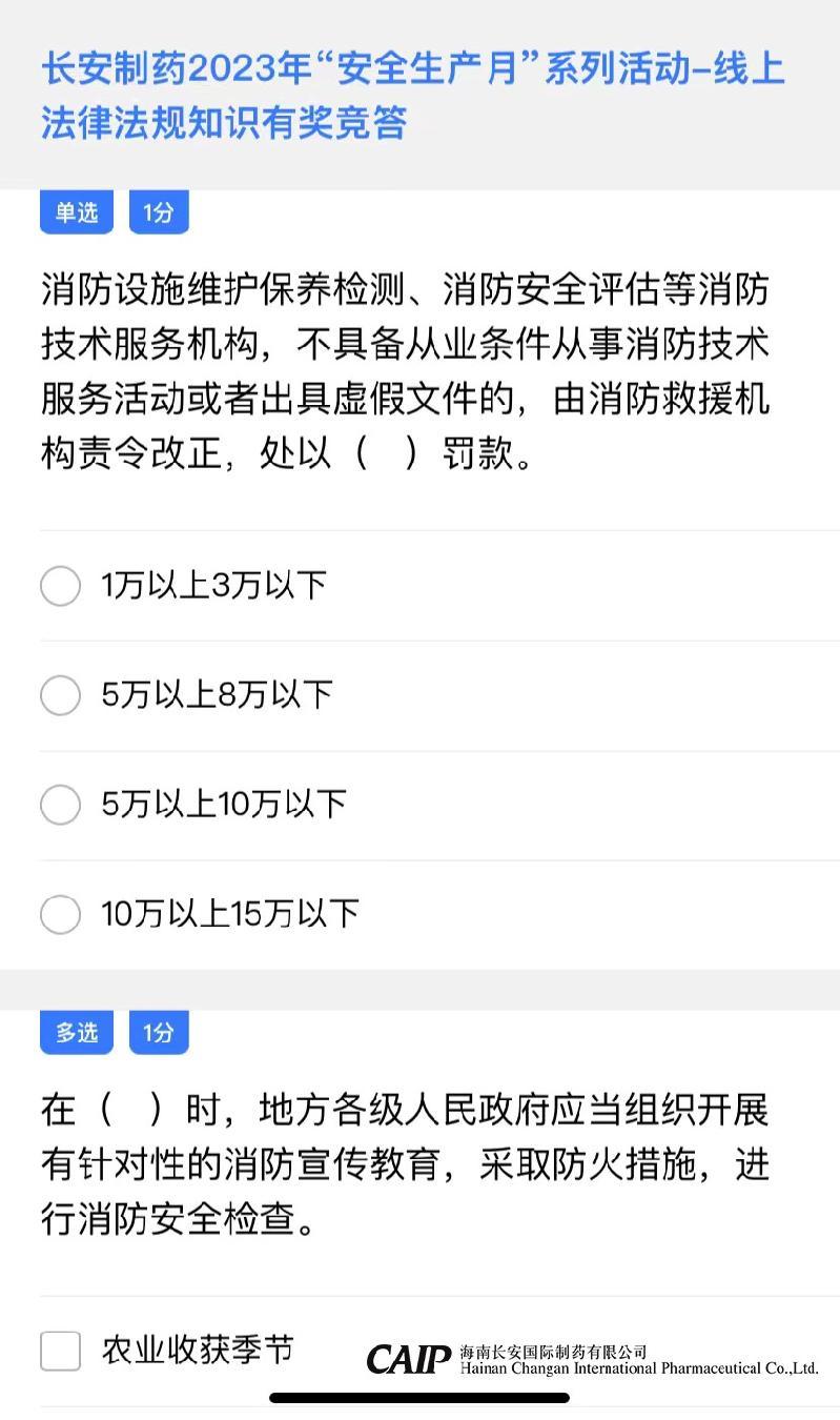 為了進(jìn)一步提高長安制藥全體員工參與學(xué)法用法的積極性和主動(dòng)性,長安制藥在安全生產(chǎn)月期間,開展了長安制藥2023年”安全生產(chǎn)月“系列活動(dòng)——線上法律法規(guī)知識(shí)有獎(jiǎng)競答,讓員工在競答中學(xué)習(xí)掌握法規(guī)知識(shí)。