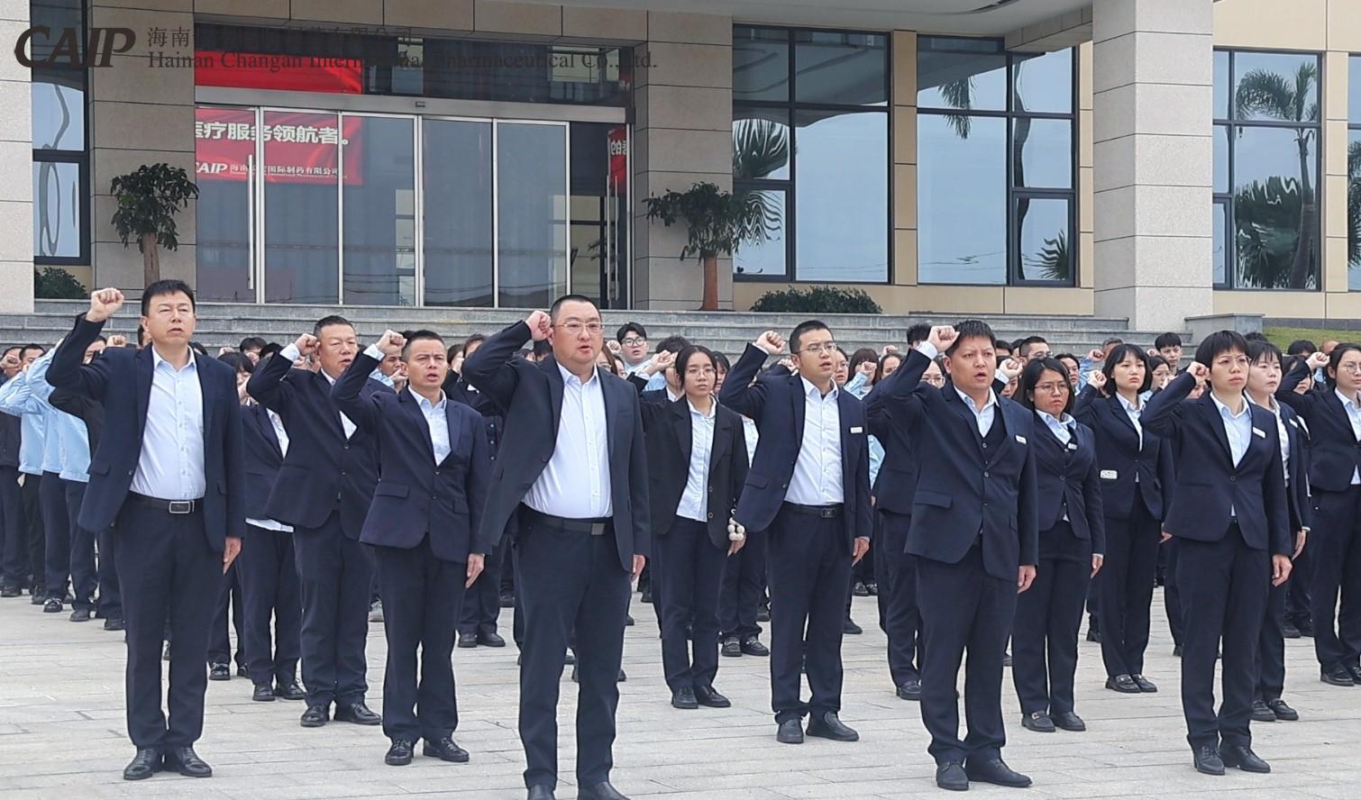 儀式啟幕,莊嚴(yán)肅穆。全體員工整齊列隊(duì),精神抖擻。英姿颯爽的護(hù)旗手邁著鏗鏘有力的步伐走向升旗臺(tái)。在激昂的國(guó)歌聲中,鮮艷的五星紅旗緩緩升起,長(zhǎng)安制藥全體員工莊嚴(yán)肅立,向國(guó)旗行注目禮,這一刻,國(guó)旗承載著全體員工對(duì)國(guó)家繁榮昌盛的美好祝愿,一同升起的司旗也象征著企業(yè)在新的一年里,為海南自由貿(mào)易港醫(yī)藥產(chǎn)業(yè)發(fā)展貢獻(xiàn)力量的堅(jiān)定決心。